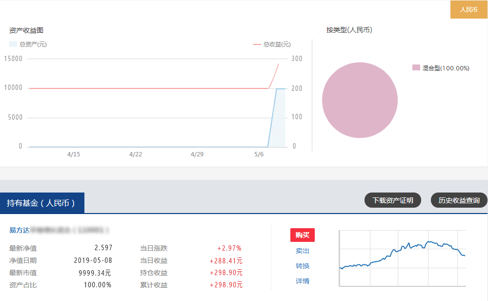 按05月10日的单位净值卖出427.84份