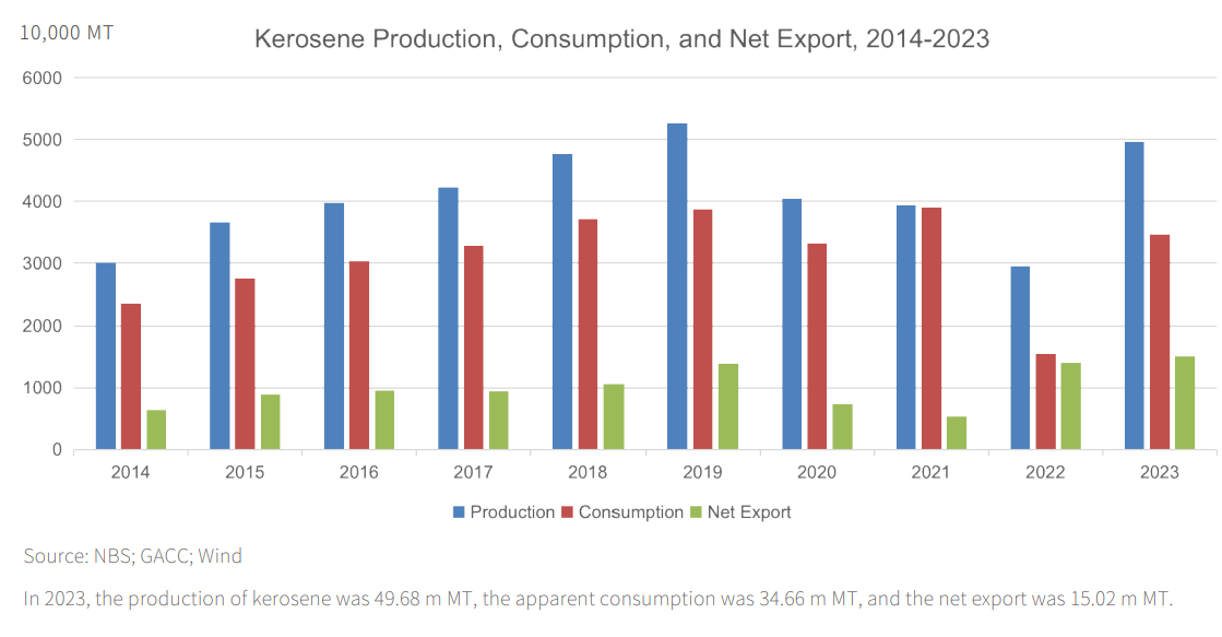 2024年中国石油市场概览——Aviation kerosene (jet fuel production and consumption continued to recover in 2023 with net export surpassing 15m MT
