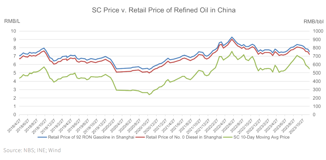 2024年中国石油市场概览——High correlation between the 10-day average SC price and the refined oil retail price in China