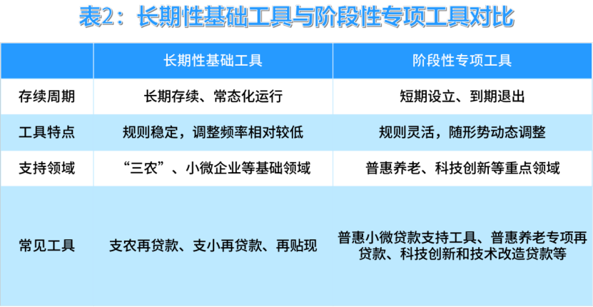 长期性基础工具主要服务于普惠金融长效机制建设,包括支农支小再贷款、再贴现等;阶段性专项工具则具有明确的实施期限或退出安排,除支农支小再贷款和再贴现之外的其他结构性货币政策工具均为阶段性工具。我们可以通过下表来大致了解。