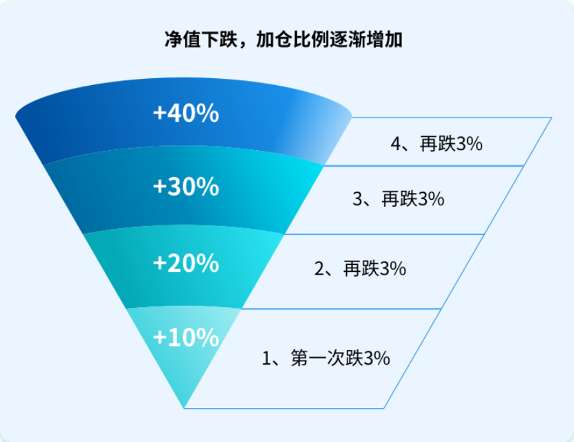 例如:将想加仓的2万元,分4批按4:3:2:1的比例加仓,即分别为8000元、6000元、4000元、2000元;基金跌了3%就加仓2000元,再跌3%就加仓4000元,依次类推。