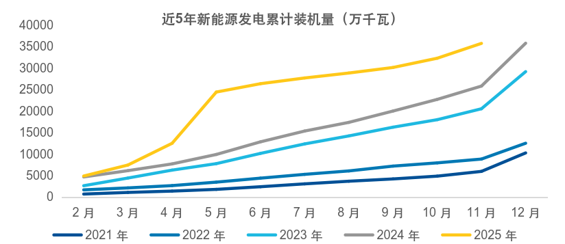在新能源装机量快速增长的背景下(如下图所示),我国“西电东送”的格局(西部风光资源丰富、东部负荷集中)决定了特高压直流输电是解决长距离低损耗传输的重要选择。同时,风光发电受天气影响明显、出力波动大,为保障电网稳定,需要对电网设备进行柔性化和智能化改造。