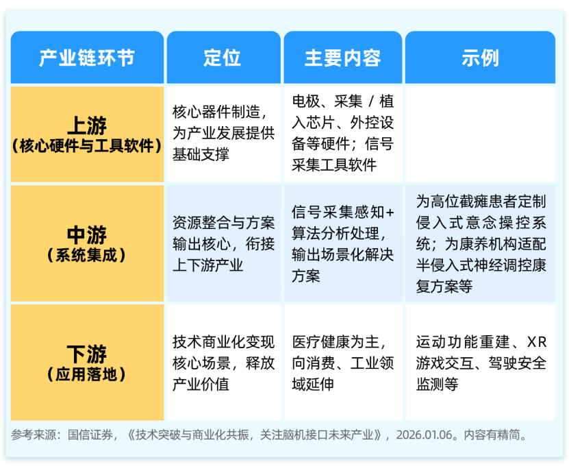 从产业链结构来看,脑机接口行业可清晰划分为上游、中游、下游三大环节,各环节定位明确、协同联动,构成完整产业生态,具体如下表所示:
