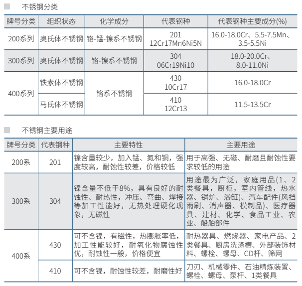 不锈钢种类繁多,按组织结构可分为铁素体不锈钢、奥氏体不锈钢、马氏体不锈钢、双相不锈钢和沉淀硬化不锈钢。按化学成分可分为铬锰镍系、铬镍系不锈钢和铬系不锈钢,分别对应于美国AISI标准的200、300和400系列。