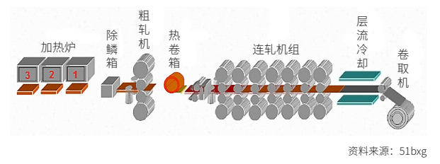 不锈钢热轧工艺是以板坯(主要为连铸坯)为原料,经加热后由粗轧机组及精轧机组制成带钢。从精轧最后一架轧机出来的热钢带通过层流冷却至设定温度,由卷取机卷成钢卷,冷却后的钢卷外表有氧化皮,呈现黑色,俗称“不锈钢黑皮卷”。经过退火酸洗,去掉氧化表面,即为“不锈钢白皮卷”,不锈钢市场流通的大部分热轧产品为不锈钢白皮卷。具体不锈钢热轧生产工艺流程如下: