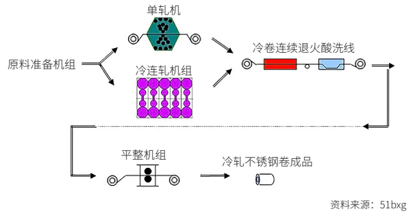 压延加工之后,生产成不锈钢冷轧产品。当前不锈钢冷轧主要生产工艺为两类:不锈钢单机架冷轧、不锈钢多机架冷轧。具体生产流程如下图: