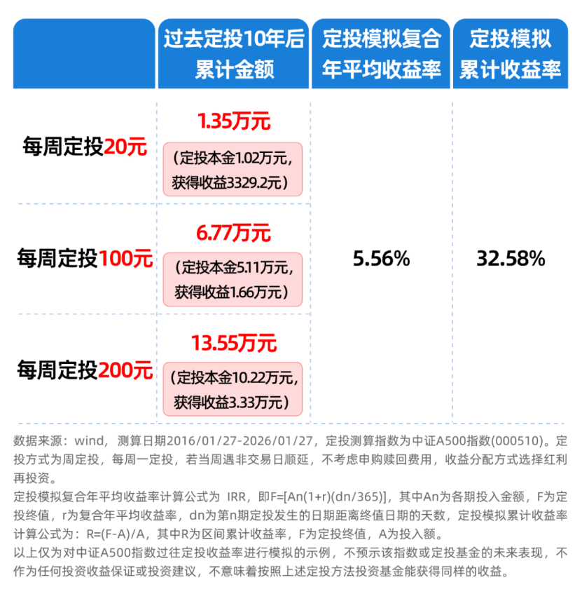 我们以中证A500指数为例进行模拟测算,假设我们过去10年期间按周定投,每周投入20元、100元、200元,10年后累计总金额见下表。