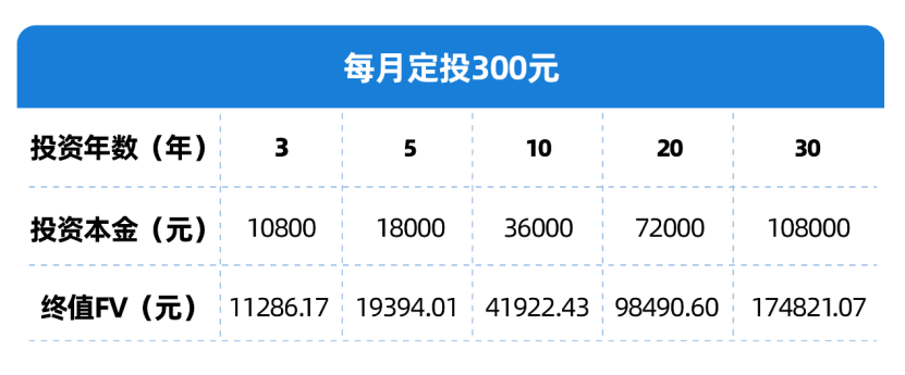 举个例子,我们每月投300块钱,假设年化收益率是3%,10年之后,我们可以收获约4.19万元,20年后约9.85万元,30年后约17.48万元。