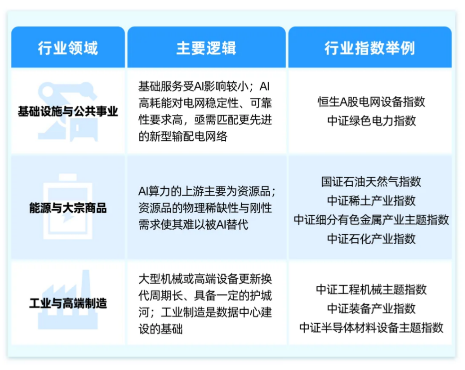 从产业逻辑出发,市场上符合“重资产、低淘汰性”特征的HALO资产,主要集中在能源与大宗商品、工业与高端制造、基础设施与公共事业几大实体领域,涉及到较多的行业指数: