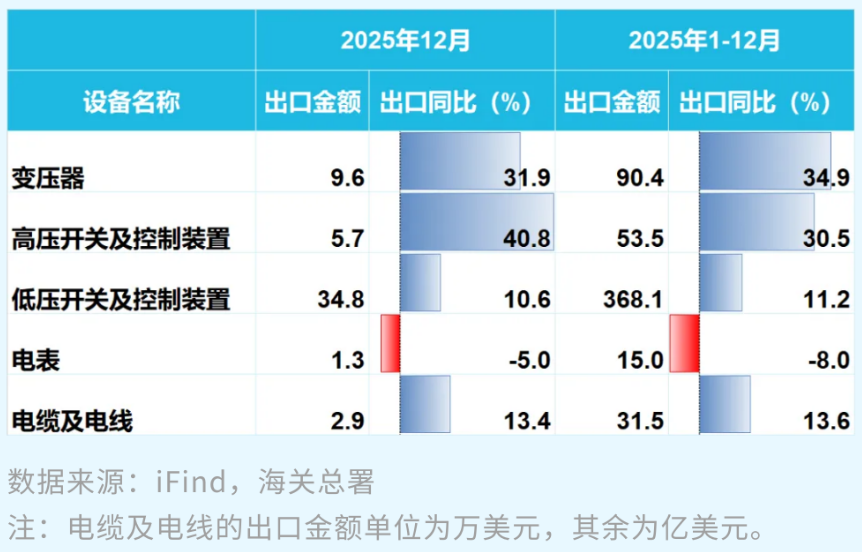 以2025年12月的单月出口数据和累计出口数据为例(如下图所示),变压器和高压开关的单月和累计出口同比增长率均在30%以上,反映出了海外对这两类产品的需求增长。