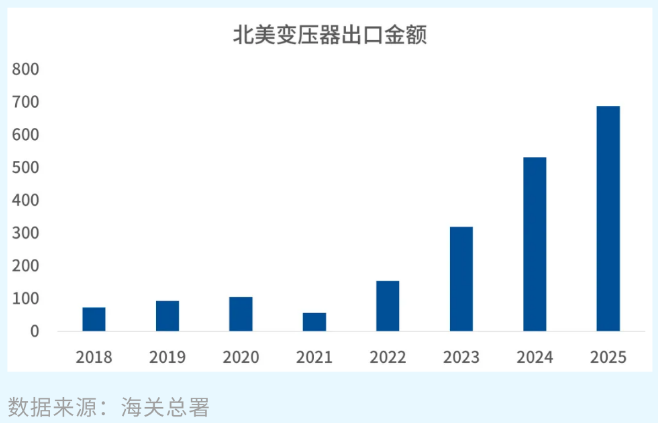 分地区来看,以对北美的变压器出口为例,即使在不考虑转口的情况下,我国出口至北美市场的变压器规模也呈现了高速增长,出口金额由2022年的1.54亿美元增长至2025年的6.88亿美元。