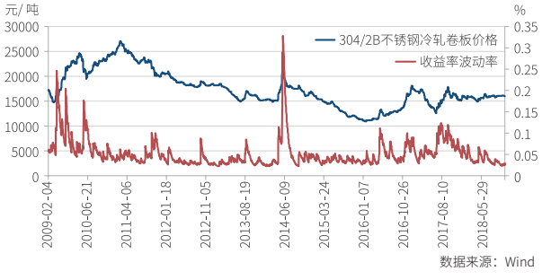 3、2016年至今,由于行业整体利润下滑,产量维持小幅增长,同时需求保持稳步增长。2016年底304冷轧价格反弹回18000元/吨高点后,至2018年底基本维持窄幅震荡运行。