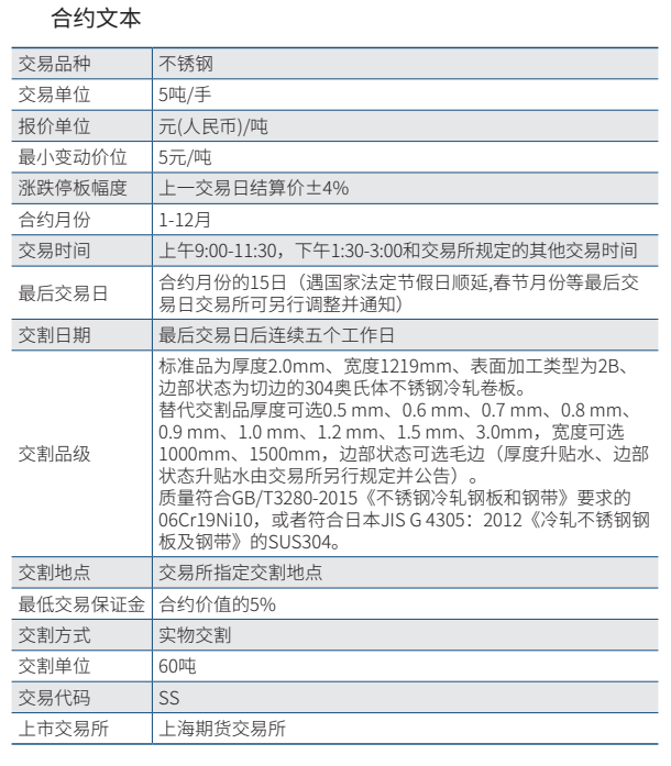 1、用于实物交割的不锈钢,质量应当符合GB/T3280-2015《不锈钢冷轧钢板和钢带》要求的06Cr19Ni10,或者JIS G 4305:2012《冷轧不锈钢钢板及钢带》的SUS304,以及上海期货交易所规定的表面质量技术要求。