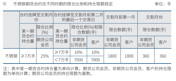 4、交割月前第一月的最后一个交易日收盘前,各会员、各客户在每个会员处不锈钢期货合约的投机持仓应当调整为12手的整倍数(遇市场特殊情况无法按期调整的,可以顺延一天); 进入交割月后,不锈钢合约投机持仓应当是12手的整倍数,新开、平仓也应当是12手的整倍数。套期保值持仓临近交割期整倍数调整参照投机持仓整倍数调整方法执行。