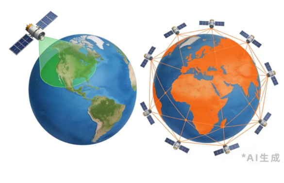 大家或许会有疑问:单颗卫星难道不能满足需求吗?为啥非得投入大量成本搞卫星组网?其实答案很简单,单颗卫星的能力有天然局限,难以撑起全球商业化服务的需求——所谓卫星组网,就是把多颗卫星联合起来工作,根据需求覆盖特定区域或全球,打造一个灵活且稳定的空间通信网络。