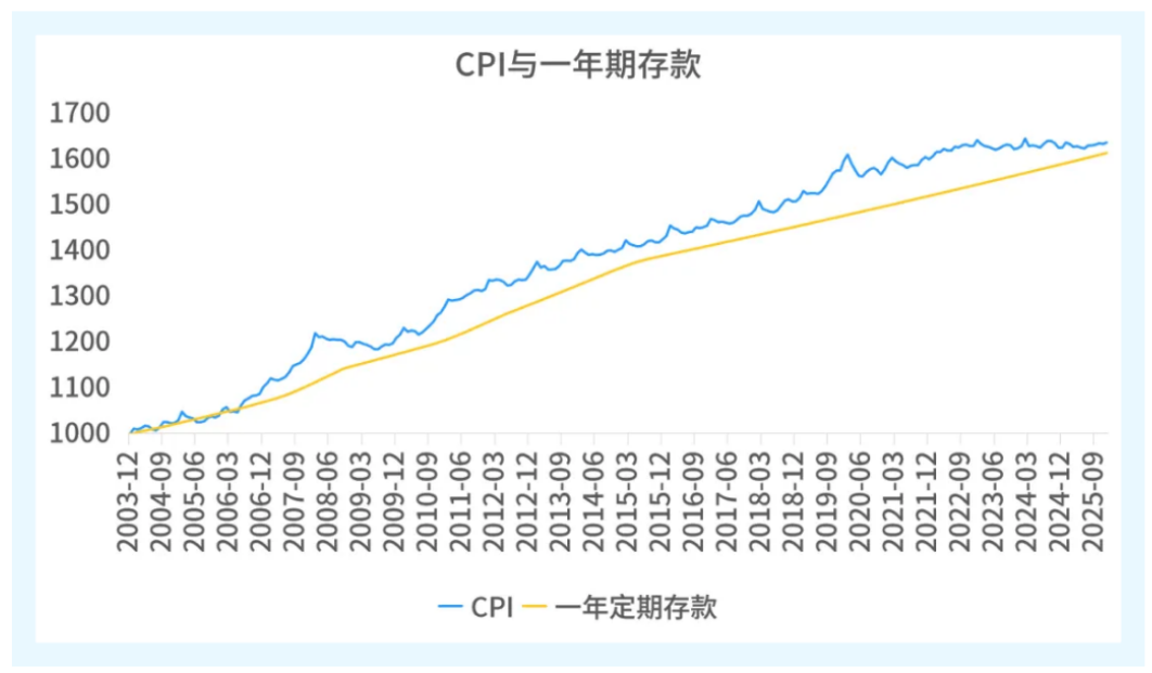数据来源:WIND。时间区间为2003/12/31-2025/12/31,CPI使用当月环比数据,存款利率使用央行公示的一年期定期存款基准利率。以2003年12月作为基期、以1000作为基点,计算后续每个月的点位后制成折线图。