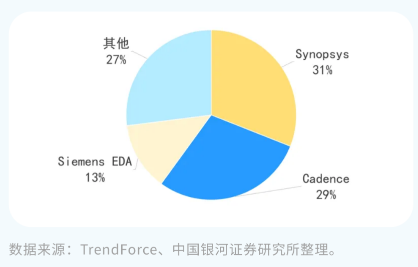 EDA(电子设计自动化)软件是芯片设计的必备工具,从集成电路的逻辑设计、仿真验证到布局布线,均需依赖其完成,是设计效率的决定性因素,其全球市场被Synopsys、Cadence、Siemens EDA三大厂商主导,虽然国内也有一些EDA企业,但市场份额较小,EDA软件仍是半导体领域的“卡脖子”环节。