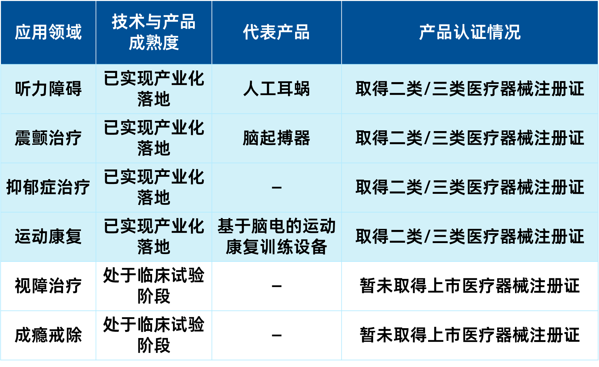 依托大脑与外部设备直接交互的特性,脑机接口可应用于多种医疗细分领域。国内企业聚焦神经、精神、感官类疾病诊治,覆盖听力、认知、睡眠障碍及抑郁症、卒中、成瘾等病症,部分领域已实现产业化,如下表所示: