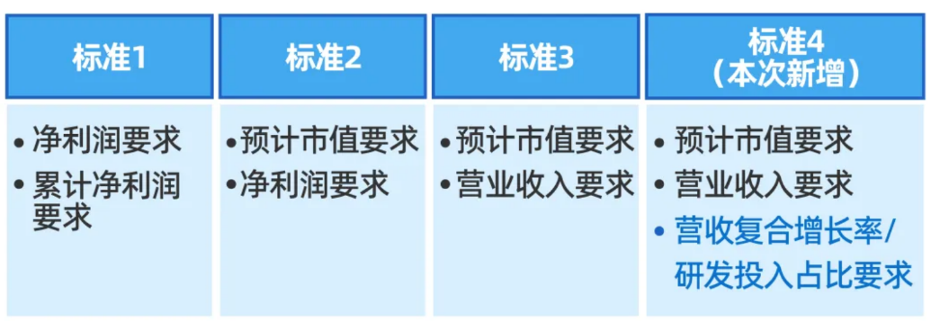 可以看到,第四套标准引入了营收复合增长率、研发投入占比等成长性、创新性指标,更加聚焦于“企业未来的发展前景”,而不是“当下盈利多少”,能够更好地倾斜支持具备高成长潜力与突出创新能力的优质企业上市。