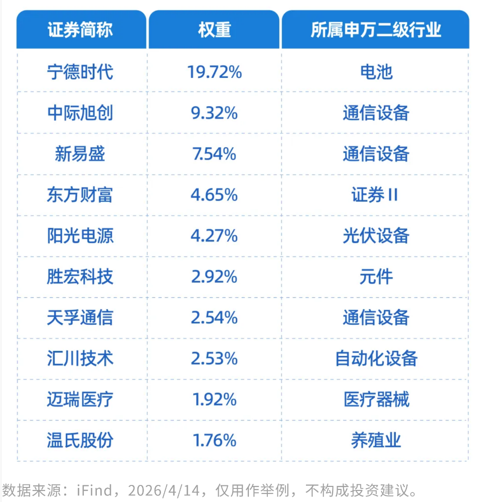 创业板指数(399006)选取创业板市场中市值规模大、流动性较好的100只股票作为样本。其中,超八成成份股集中于电力设备、通信、电子、医药生物、计算机等新质生产力主力行业,前十大成份股也多为电池、通信设备、光伏设备、医疗器械等新质生产力“含量”高的龙头公司,部分成份股明显受益于本轮AI基础设施投资需求的大幅增长。