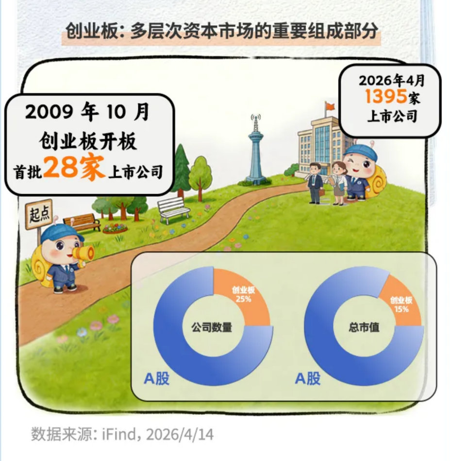 截止2026年4月14日,创业板已支持1395家公司上市,约占A股上市公司总数的25%。